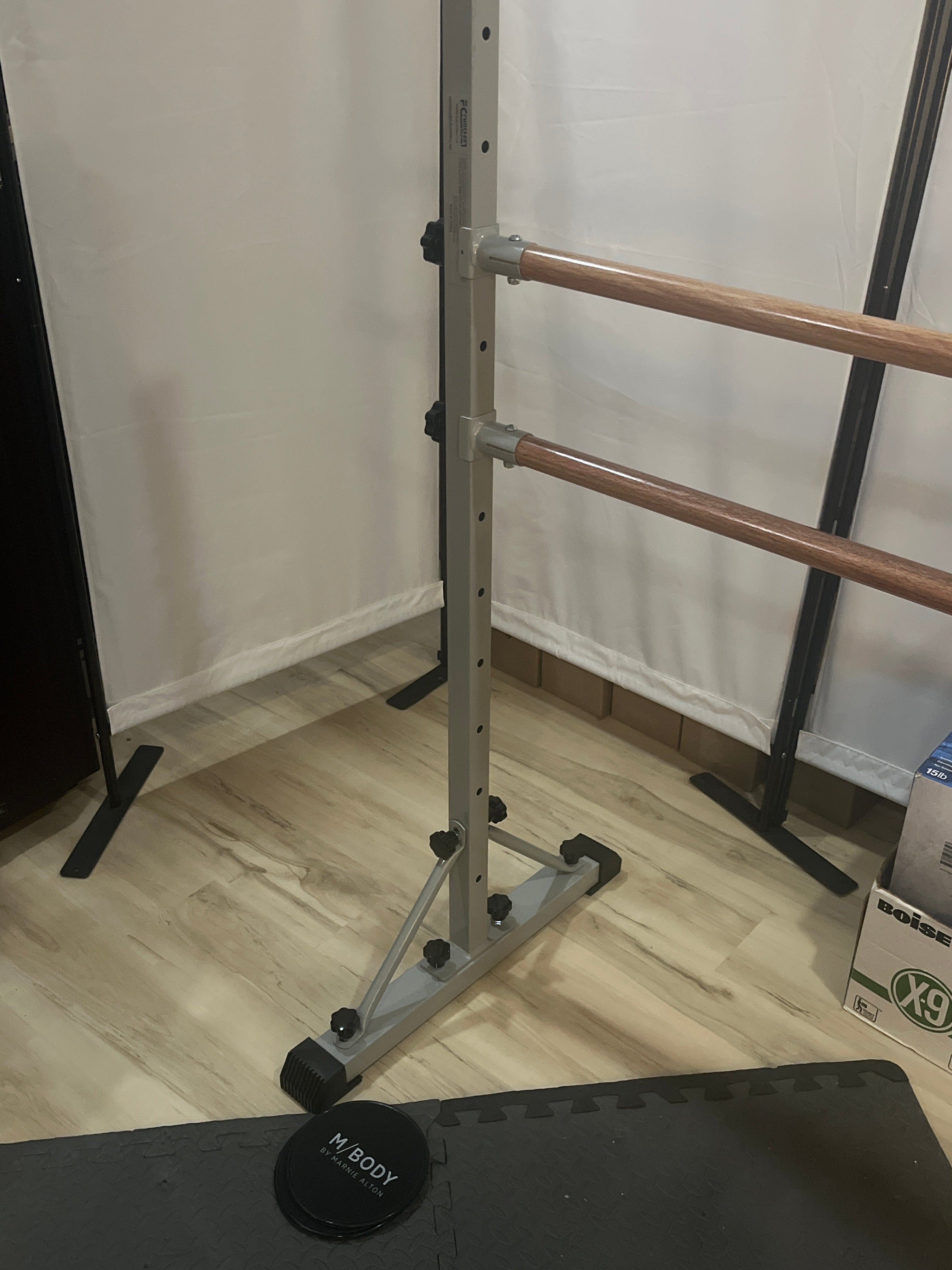 Set up my barre just in time for ballet stretch today. Not pictured, a fresh cup of mint tea and a new reed essential oil diffuser from Rituals. Trying to create a distinct mood in the space that shares my home office set up. Day ✌🏻complete 💖